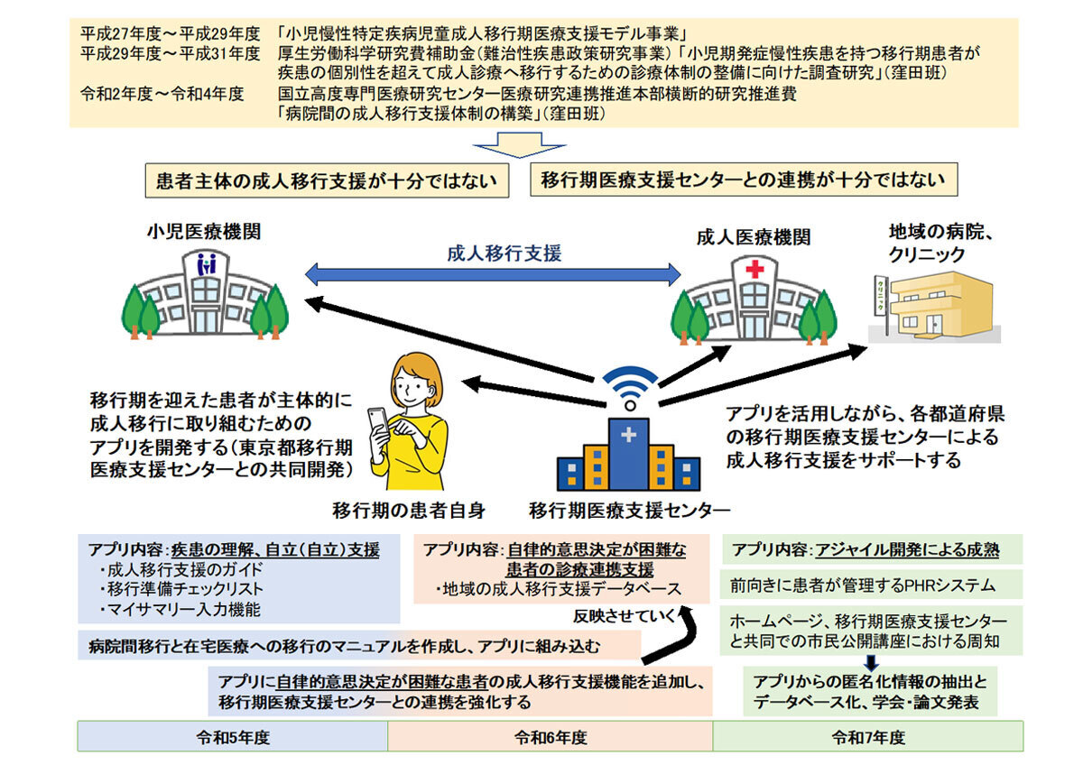 ただし、患者目線での課題の抽出なくしては、病院の都合の問題と誤解されてしまうことになりかねません。今回の調査研究で成人移行支援アプリを開発、運用することにより、患者家族の「困りごと」を抽出することが可能になり、患者さん自身が主体的にアプリを活用することで、自立可能な患者ではその自立(自律)支援が進み、患者主体の成人移行支援を進めることができるようになります。また、自律的意思決定が困難な患者でも支援を受けやすくすることができます。その開発、運用を移行期医療支援センターと一緒に行うことによって、移行期医療支援センターの持つ地域の情報の提供や、webでの講演会の案内などが容易になります。そのため、今回の調査研究は、移行期医療支援センターを中心とした移行期医療支援体制の構築に寄与し、難病・小児慢性特定疾病対策の推進に貢献すると考えられます。